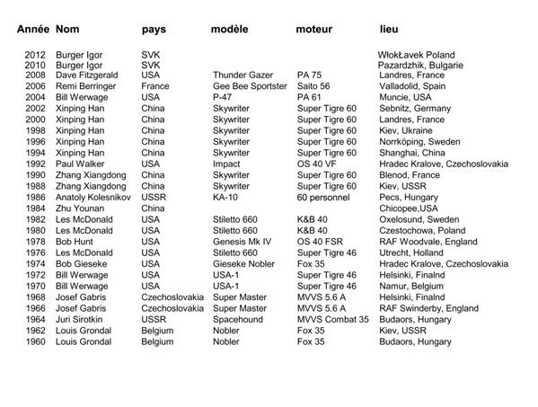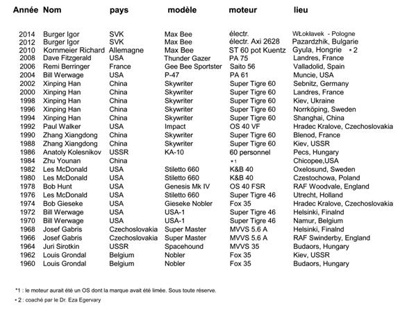 Et bien en effet, une vérification plus précise de mes archives confirme que Richard Kornmeier fut le champion du monde, second Vejmola Jiri, troisième le champion actuel, Orestes Hernandez, Han Xinping quatrième, David Fitzgerald champion sortant cinquième et enfin Igor Burger 6ème... son copain Shrek , 9ème , aucun français qualifié pour les fly off...