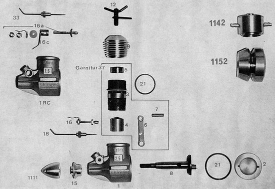 Au début des années 60 la concurrence est rude dans la catégorie des moteurs de 2,5cc de cylindrée. C’est un secteur en pleine croissance du fait de l’augmentation de la pratique du V.C. C, mais aussi depuis peu du vol télécommandé qui avec l’arrivée de nouveaux ensembles meilleurs marché et plus logeables attire de plus en plus de modélistes. Notre constructeur Berlinois propose depuis 1953 le MACH 1 (page 27) pour les modélistes attirés par les compétitions et pour ceux qui sont moins attirés par les performances, depuis 1958 le KOMET (page 56) en remplacement de la première génération de WINNER. Même si il fait mieux que son clone le BULLY (page 56) de 3,5cc de cylindrée remplacé par le BULLY 2 (page 62) dès le début de 1961, il est loin de répondre aux espérances commerciales mises en lui. Aussi au cours de l’hiver 1961/62 pour ne pas se laisser distancer l’étude d’un successeur est lancée. Pour mettre toutes les chances de son côté et aussi pour limiter les coûts de développement il est décidé de s’inspirer de la dernière génération du RECORD de 1 ,5cc de cylindrée qui donne entière satisfaction depuis son lancement en 1959. Lors de sa présentation il donne une impression de déjà-vu puisque c’est l’exact agrandissement du RECORD 2. Enfin presque car il y a une différence au niveau du pointeau. Celui-ci n’est plus dirigé vers l’arrière pour éloigner les doigts du champ de rotation de l’hélice, Il est maintenant parallèle à cette dernière. Cela va permettre de proposer à partir du même carter deux versions, une pour le V.C.C et le vol libre et une pour le vol R.C. Grace à une réserve de matière sous la buse il est possible grâce à un perçage de plus grand diamètre d’installer un boisseau rotatif. Traversé par l’ensemble pointeau/gicleur il est muni de deux perçages de diamètres différents pour faire varier le débit d’air en fonction de la rotation qui est limitée par deux butées. Si cela peut paraitre simpliste de nos jours, il faut se rappeler qu’à cette époque les radiocommandes sont ‘’tout ou rien’’, le débattement des servos n’est pas progressif. Comme sur le reste de la gamme, on retrouve la tige filetée qui ce visse dans le vilebrequin. Cette solution si elle évite de tordre le vilebrequin en cas de retour violent sur la planète à l’inconvenant de nécessiter l’emploi d’hélice avec un moyeu de grand diamètre. Importé en France par SCIENTIFIC FRANCE, il est disponible dès le mois de mars 1962. Vendu 65 frs en version V.L /V.C.C et 72 frs pour le vol R.C. Il trouve en face de lui plusieurs concurrents. Un seul est une production nationale, il s’agit du MICRON RACING SPORT. Il est disponible uniquement sans réglage du régime moteur. S’il n’a pas à rougir au niveau de la qualité de construction et des performances, le bât blesse au niveau du prix : 90 frs. Heureusement pour les modélistes mais aussi pour le constructeur, grâce à certains organismes le différentiel est gommé. Pour les modèles importés on trouve importé par ARBOIS les TAIFUN RASANT 2 et ZYKLON (page 54) vendu respectivement 60 et 84 frs. Si ils vont accompagner le WINNER 2 tout au long de sa carrière française: le RACING SPORT ou presque : les TAIIFUN, il va y en avoir d’autres dont la diffusion a été plus limitées que ce soit dans la durée ou bien dans le nombre de point de ventes. Le modéliste trouvera chez les revendeurs qui distribuent ROBBE le JAGUARD 2,5cc de fabrication allemande mais disponible uniquement en version V.C.C. Pour ces même pratiquants BABY TRAIN va proposer l’X3 du constructeur Hongrois ALAG. De son côté LA SOURCE DES INVENTIONS va avoir assez brièvement dans son catalogue le REBEL 2,5cc qui lui bénéficie d’une version R.C. c’est une production du constructeur hongrois FOK spécifiquement pour le distributeur allemand ENGEL. Comme bon nombre de moteur « loisir » il va connaitre une carrière discrète mais néanmoins longue puisqu’il ne disparait du catalogue du constructeur qu’à la fin des années 70. Il va connaitre quelques évolutions. En 1964 l’anodisation de couleur rouge disparait et la forme de la culasse change. Elle va être modifiée au moins encore une fois par la suite. Le vilebrequin est également revu : Exit le filetage amovible, Il devient plus classique avec son extrémité filetée. Pour compléter l’offre une version à destination du modélisme naval avec une culasse à circulation d’eau est proposée. Lorsque la production s’arrête il n’est pas remplacé, l’époque n’est plus aux moteurs diésel. Il faudra attendre le début des années 90 pour voir WEBRA avec le SPORT 10 et le SPEED 28 faire une brève réapparition sur ce créneau.