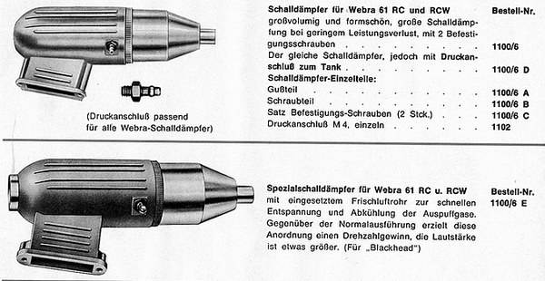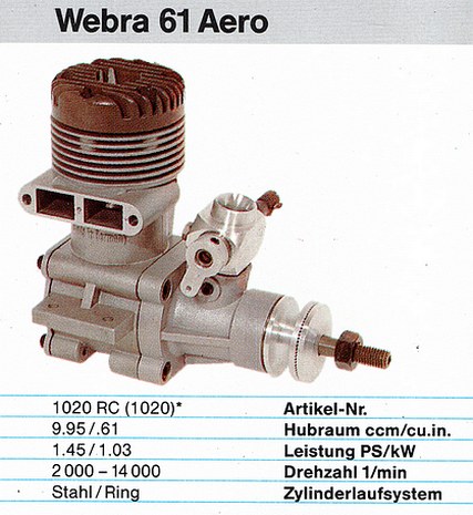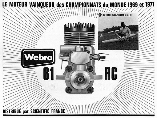 Dès la seconde moitié des années 50, on comprend chez WEBRA qu’il n’y aura pas d’avenir pour l’entreprise sans une gamme de moteurs « glow ». Sont ainsi lancé le GLOW SPORT (page 28 ), le MACH 1 GLOW (page 14), le BULLY 2 GLOW (page 31) et enfin en 1962 le BIG BEN de 5cc de cylindrée. Au vu de la vive concurrence qui règne dans la première moitié des années 60, il est clair qu’à Berlin, on a vu juste. Pour rester dans le coup dès 1963 il est décidé de procéder à des renouvellements. Ainsi en 1964 le BULLY 2 GLOW qui n’a pas connu un grand succès est remplacé par le GLOW STAR (page 32) tandis qu’en 1966 c’est une nouvelle version du SPORT GLOW (page 29) qui est présentée. Par contre il est décidé de ne pas procéder au remplacement du MACH 1 GLOW et du BIG BEN et de se positionner à la place sur le créneau des 10 cc de cylindrée destiné au vol télécommandé. La concurrence y est moins vive et les perspectives commerciales sont intéressantes au vu de l’augmentation régulière du nombre de pratiquant. Dans le courant de 1966, le développement de ce nouveau moteur est confié au motoriste réputé Gunther BODEMANN qui vient de réintégrer l’entreprise après un passage chez TAIFUN. C’est à la fois le premier 10 cc de cylindrée et le plus gros moteur jamais développé par l’entreprise berlinoise. Si l’on retrouve des solutions déjà employée comme le palier avant démontable, d’autres sont nouvelles pour le constructeur comme le piston en dural décolleté qui est muni d’un segment en fonte aciérée ou bien la tête de bielle qui comporte un roulement à aiguilles. Un soin particulier a été porté dans la conception du carburateur. Il comporte un contre pointeau mais surtout le boisseau rotatif a un mouvement hélicoïdal ce qui me semble être une première. Lors des essais effectués à la fin de 1966, des mesures de performances ont été réalisées et il a été enregistré une puissance maximum de 0,93 cv. Cela le situe dans la bonne moyenne. Elle a été obtenue à 14 500 tr/mn. La première présentation publique à lieu au début de 1967 lors du célèbre salon de Nuremberg où plusieurs exemplaires de préséries figurent en bonne place sur le stand de l’entreprise. La qualité de fabrication et la robustesse des pattes de fixation sont en particulier remarqué par les visiteurs. Alors que la production en série se prépare un changement est apporté au silencieux. Sur les premiers exemplaires réalisés il y a une prise d’air annulaire située à l’arrière. Il s’avère que pour une production en grande série elle est complexe à réaliser. Après plusieurs essais comparatifs avec des silencieux ne la comportant pas, devant le peu d’améliorations que ce soit au niveau des performances ou bien du bruit, il est décidé de l’abandonner. A noter qu’il est vendu séparément. De série le moteur est muni d’un papillon commandé par le carburateur et obstruant la sortie d’échappement. La commercialisation démarre au printemps. En France c’est SCIENTIFIC FRANCE qui va le distribuer. Il va connaître une carrière assez discrète malgré qu’il soit vendu par de grand magasin comme le parisien : A la source des inventions. Cela tient au fait que sur le créneau auquel il s’attaque est encore embryonnaire chez nous et que des concurrents comme SUPER TIGRE, O.S ou bien encore ROSSI sont déjà présent depuis plusieurs années. En dehors de l’Europe, c’est sur le marché américain où elle est déjà présente depuis plusieurs années que l’entreprise fonde de grands espoirs. Un accord de distribution est signé avec un important acteur du secteur : MODEL RECTIFIER CORPORATION qui remplace WESTEE HOBBY IMPORTS. En complément une version à destination du modélisme naval lancée. Sur le carter les ailettes de refroidissement sont remplacées par une bague assurant une circulation d’eau. Pour ne pas se laisser distancer par la concurrence, Gunther BODEMANN travail à l’améliorer. C’est ainsi qu’au début de 1969 est présenté une version améliorée : le 61 R/C BLACK HEAD. Ce choix en 1966 d’investir le créneau des 10 cc R/C et le travail mené durant ces trois années vont être bénéfique pour la notoriété de l’entreprise : Le 27 juillet 1969, le suisse Bruno GIEZENDANNER avec son avion motorisé par un 61 R/C BLACK HEAD devient champion du mode de voltige R/C. La compétition qui se déroulait en Allemagne à Brême-Lemwerder avait débuté le 23 juillet.