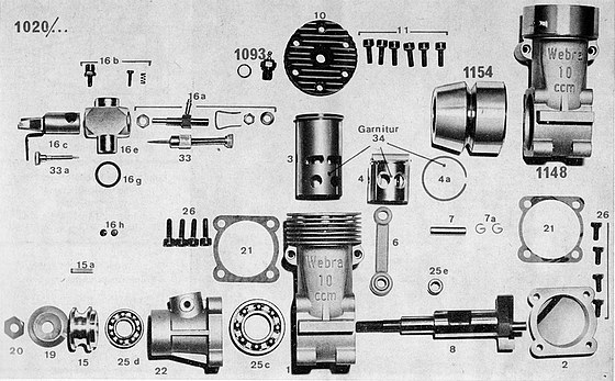 Si depuis sa commercialisation au printemps de 1967, le WEBRA 10cc a de bons résultats commerciaux, il apparaît assez rapidement aux dirigeants de l’entreprise qu’il faut l’améliorer face aux progrès réalisés par la concurrence. Gunther BODEMANN se remet donc au travail. Les premiers travaux portent sur le canal de transfert des gaz. Il est redessiné. Sa forme est moins trapézoïdale et sa partie supérieure est maintenant plus large, 23 mm contre 22 mm précédemment. Le cylindre est également retravaillé au niveau de l’échappement qui comporte maintenant 6 lumières carrées au lieu de 4. Cela augmente notablement sa surface qui est maintenant supérieure à celle de l’admission. Comme le dit Pierre DELFELD lorsqu’il en fait l’essai pour la revue Radio Modélisme, le moteur respire mieux et cela se ressent sur les performances. Ainsi la puissance maximum qui était de 0,93 cv à 14 500 tr/mn passe à 1,05 cv à une vitesse de 13 800 tr/mn. La progression est faible mais c’est sur le couple que le gain est important comme on peut le voir sur les documents en annexe. Face à la concurrence, ses performances lui permettent de rester dans le peloton de tête. Il est présenté pour la première fois au mois de janvier 1969 lors du salon de Nuremberg. Pour bien se démarquer de la précédente génération la culasse est maintenant de couleur noire. Comme pour son prédécesseur une version avec le carter refroidi par circulation d’eau est réalisée à l’attention du modélisme naval. A noter que même si le renflement est toujours présent dans la sortie d’échappement, le moteur est maintenant livré sans le volet commandé par le carburateur qui s’achète séparément tout comme l’échappement qui comporte maintenant sur la partie arrière un petit bossage pour permettre l’installation d’une prise de pression. L’entreprise visant principalement le marché américain il est baptisé 61 RC-BLACKHEAD. La commercialisation débute au printemps. Elle va être boostée dès le mois de juin suivant grâce au suisse Bruno GIEZENDANNER qui devient champion du monde de voltige. Titre qu’il conservera lors de l’édition suivante en 1971, son avion étant toujours motorisé par 61 RC-BLACKHEAD. A la direction de l’entreprise on est satisfait car sur l’important marché américain la réussite commerciale est au rendez-vous et cerise sur le gâteau, il en est de même en Europe. De l’autre côté de l’atlantique Il va également réaliser de nombreux podiums comme lors des éditions 1971 et 72 des « Nationals » organisé par l’A.M.A dans la catégorie voltige R/C. Malheureusement Gunther BODEMAN ne va pas beaucoup se réjouir du succès de son petit dernier, il décède des suites d’une longue maladie au mois d’octobre 1971. C’est Peter BILLES qui arrive de chez H.P qui va maintenant être en charge du développement technique de la gamme. S’il commence par concevoir un nouveau 10 cc de cylindrée utilisant le principe schnuerle pour l’alimentation, le futur SPEED 61 (page 29) il va en même temps continuer à améliorer le 61 RC-BLACKHEAD car la direction de l’entreprise pense que les deux moteurs vont être complémentaires. Ainsi l’équilibrage du vilebrequin est modifié pour réduire les vibrations à haut régime. Dans ce travail il a été aidé par le professeur METZMEIER de l’université technique de Berlin. Toujours sur le vilebrequin l’admission des gaz est agrandie ce qui permet d’augmenter le temps d’ouverture et de fermeture d’environ 10°.Un nouveau piston plus léger est mis au point en collaboration avec l’entreprise MAHLE qui réalisait déjà le précèdent. Son axe est également allégé. C’est maintenant un tube creux ce qui permet de ramener son poids de 3,3 à 2,4g. La bielle évolue aussi, son pied est maintenant muni d’une bague en bronze. Sur le carburateur le diamètre du passage d’air passe de 7 à 8mm. Le silencieux bénéficie aussi de modifications. Le diamètre de la sortie d’échappement est agrandi à 10 mm. En même temps un deuxième silencieux avec une prise d’air à l’avant de 15 mm de diamètre est réalisé. Si il la perte de puissance est moindre il a par contre le défaut de moins limiter le bruit. Toutes ces modifications sont bénéfiques puisque lors des derniers essais une puissance maximale de 1,4 cv à 14 000 tr/mn a été enregistrée. Cela constitue un progrès notable et lui permet ainsi de rester concurrentiel. Sa commercialisation débute en 1973 sous la désignation 61 RC-BLACKHEAD série 73. Lancé en même temps que le SPEED 61 il va permettre à WEBRA de proposer aux modélistes qui ne recherchent pas la puissance absolue une alternative plus économique. Il est en effet vendu 585,00 frs contre 655,00 frs pour le SPEED 61. Il va ainsi poursuivre sa carrière jusqu’en 1997 avec seulement quelques changements au niveau du silencieux et du carburateur. A cette date il assure encore parfaitement son rôle d’entrée de gamme puisqu’il est vendu 835 frs alors que le SPEED 61 AERO coute lui 1804 frs. En 1985 peut être à la demande de l’importateur américain pour lutter contre l’arrivée de plus en plus importante de moteurs en provenance d’Asie, une nouvelle version est étudiée à Berlin avec pour objectif d’abaisser le prix de vente. Pour y arriver plusieurs actions sont menées. Le carter ne reçoit plus de traitement de surface et reste brute de fonderie. La culasse perd sa couleur noire. Sur la bielle le roulement à aiguilles est remplacé par une bague en bronze. Baptisé SILVERLINE 61 il est vendu 94,95 $ équipé d’un silencieux, le BLACKHEAD 61 coutant lui 99,95 $ sans le silencieux. Les U.S.A vont être son principal marché. En France il n’a été que brièvement proposé. Il en est peut être de même dans le reste de l’Europe. Sa commercialisation s’arrête également en 1997. Comme pour le BLACKHEAD 61 il va y avo