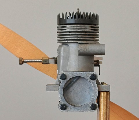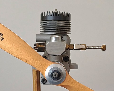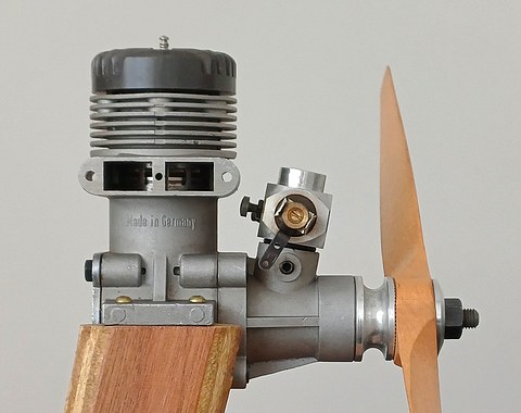 A la fin de la seconde guerre mondiale dans la partie occidentale de l’Allemagne toutes les activités aéronautiques y compris l’aéromodélisme sont interdites. De fait la production de moteurs qui était devenue anecdotique à partir de 1943 est totalement à l’arrêt. A la fin des années 40 la situation économique s’améliorant quelque peu, certains fabricants de jouets scientifiques ont alors l’idée de proposer des moteurs thermiques qu’ils vont installer sur des socles comme cela se faisait par exemple pour les machines à vapeur. Ainsi à Berlin le magasin «la boite à jeux » vend un « petit diesel » de 3,7 cc de cylindrée tandis qu’à Nuremberg Ernst RAUCH en conçoit un de 3,2cc. Il est d’une conception très classique pour l’époque avec le piston qui fait office de tiroir de distribution. La culasse est amovible et le cylindre reçoit une chemise en acier dans lequel sont fraisés 4 transferts. Le piston est sans segment. Son diamètre et sa course sont identiques soit 16 mm. Je n’ai pas trouvé d’informations sur les performances générales mais vu l’usage prévu pour ce moteur il très probable que lors de la conception c’est plus une facilité de démarrage associé à une faible vitesse de de rotation plutôt qu’une puissance élevée qui a été recherchée. La petite dimension de l’échappement et des 4 transferts tend à confirmer ce choix. Ernst RAUCH va vendre son moteur en direct mais aussi via des revendeurs spécialisés. Il a de grandes ambitions commerciales car la notice d’utilisation en allemand est également traduite en 4 langues : français, italien, anglais et espagnol. Un cas unique il me semble à la fin des années 40. Bien qu’il soit proposé au moins jusqu’en 1956, le succès n’est pas au rendez-vous et peu d’exemplaires vont être construit. Cela tient à mon avis à au moins deux choses, d’une part un marché de taille réduite et d’autre part le fait qu’en fonctionnement il est beaucoup plus salissant qu’un moteur à vapeur ce qui a du rebuter beaucoup de parents voulant faire un cadeau à leurs adolescents. Sur internet il est possible de voir plusieurs photos d’une version destinée à l’aéromodélisme. Je ne pense pas qu’elle ait été proposée par Ernst RAUCH. En effet dès 1951/52 alors que l’interdiction de la pratique de l’aéromodélisme était levée depuis quelques mois plusieurs constructeurs allemand comme BWM, METRO, TAIFUN, WAF ou bien encore WEBRA vont commercialiser des moteurs nettement plus performants. C’est pour moi une réalisation beaucoup plus récente obtenue en réalisant un plateau d’hélice et une nouvelle culasse pour avoir les ailettes orientées dans le sens du vol.