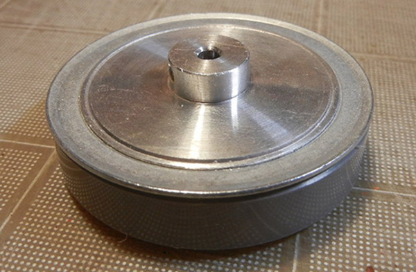 elle tourne pas vraiment rond avec un léger voile… je vais supprimer les flasque en acier et le moyeu central qui ne sont pas nécessaires puisque cette poulie doit tourner "folle" sur un axe.