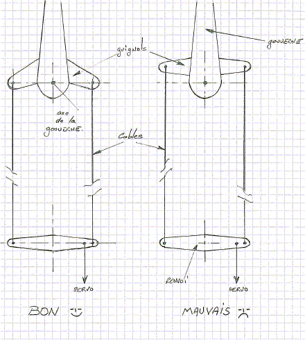 avec les cables, il faut veiller à ce que la droite qui passe par les trous des guignols passe par le point d'articulation de la gouverne afin d'avoir toujours la meme tension sur les cables quelquesoit la position de la gouverne.
