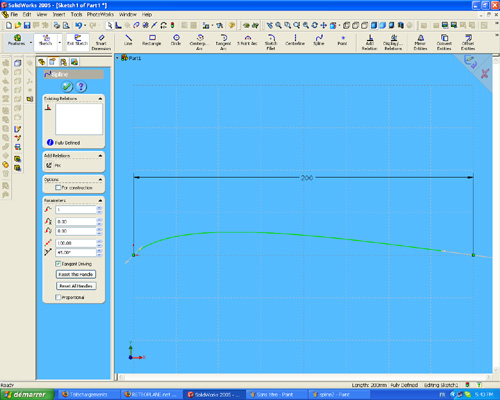 Tu peux donner des contraintes pour que ta spline soit tengente à des arc, des droites ou d'autre spline que tu aurais dessinées dans l'esquisse active ou toute autre esquisse antérieure mais tu peux aussi utiliser l'outil "tangent driving" que tu obtiens en cliquant sur ta spline et en activant l'onglet du tangent driving.