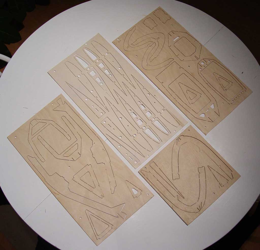 Pour ma deuxième construction dans le monde du modélisme (la première étant le KA7), j'ai opté pour ce projet. J'ai rencontré Vincent au détour d'une page web, et je l'ai contacté. Nous avons pas mal discuté et je me suis dis qu'il avait l'air de savoir de quoi il parlait. Donc pourquoi ne pas m'éssayer à ce modèle plutôt qu'un autre ? Surtout qu'il à une forme assez spéciale et sympatique. Donc mon aventure commence avec ces quelques pièces découpées à la CNC (par un copain que je remercie et qui se reconnaîtra) dans des plaques de CTP et de BALSA. |