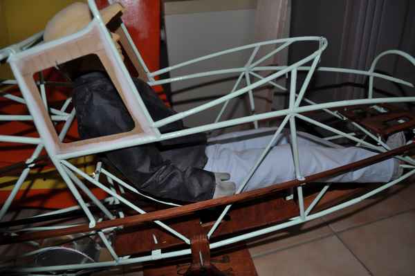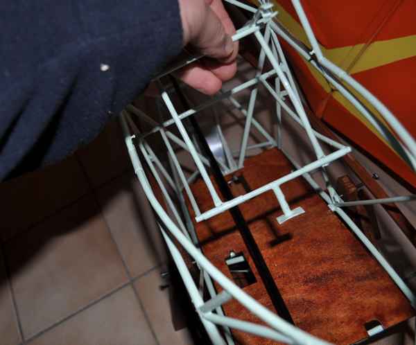 En fait pour le siége , j'ai modifié légèrement celui d'origine en l'articulant sur deux axes . il pivote sur la barre supérieure , et peut remonter à 180° . Sur ce cadre est fixée la partie avant qui elle aussi pivote sur l'arrière et possède un pied qui repose sur la platine en bois , et à l'avant deux crochets qui se clipsent sur le plancher du fuselage.