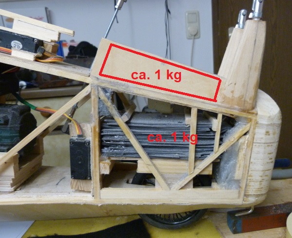 Blei habe ich ca. 2 kg in der Nase versteckt. Ich muss dann, wenn es mal nicht regnet, nochmal den Schwerpunkt auswiegen.