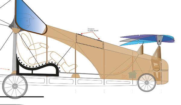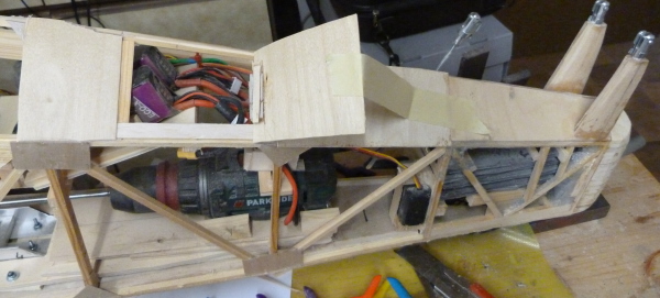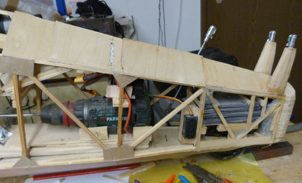 Je préfère travailler avec du bois plutôt qu'avec du métal. C'est pourquoi j'ai décidé d'ouvrir la structure en bois. En effet, j'ai découpé les barres. J'ai ainsi pu assembler la structure métallique pour la propulsion à l'extérieur et l'insérer en un seul morceau dans le fuselage de l'avion.