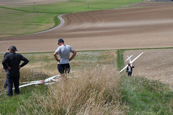 Retour sur la pente W de la veille en fin de matinée. Le vent est d'abord un peu trop nord (venant de la droite) puis s'établit nord-ouest, plus ou moins dans l'axe, vers la mi-journée. Prennent l'air Les SB10 de David, mes ASK18 et Grattouillard, le Ka8b de Fabrice G, le 4m de Michel M, le Bannsperber de Michel L, malheureusement crashé sur problème radio, les SB10 et Bergfalke d'Alex, le Dandy de Michel, le canard "A l'envers" de Séb, et un peu plus en contrebas sur une zone herbeuse plus pentue où la portance semble plus régulière, les magnifiques Aispeed Tern de David, Helios Berliner de Bernard volant au ras des herbes, les Bannsperber de Rémy et Simon, le Mü28 de Fabrice G...