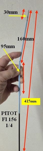 Voici le côtes au 1/4 , la partie de 95mm est le même tube que le support ,il est collé et empêche le Pitot de reculer sur le support . Je ne l'ai jamais perdu en plus de 70 vols .