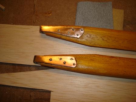 Die Strebenbeschläge sind rumpfseitig fertig. Geklebt und mit Messingnägeln verstiftet.