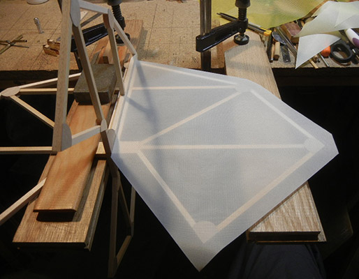 On voit bien les nervures, la toile d'entoilage, et le câble qui fait le Bdf.
