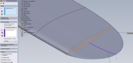 Fractionnes en deux esquisses tes esquisses profil et vue de dessus au niveau du plan de la courbe guide. Ça donne un demi profil avant et un demi profil arrière. Ces deux esquisses doivent êtres fermées. Plus deux demi vue de dessus. Celles ci seront ouvertes, se sera les nouvelles courbes guides.