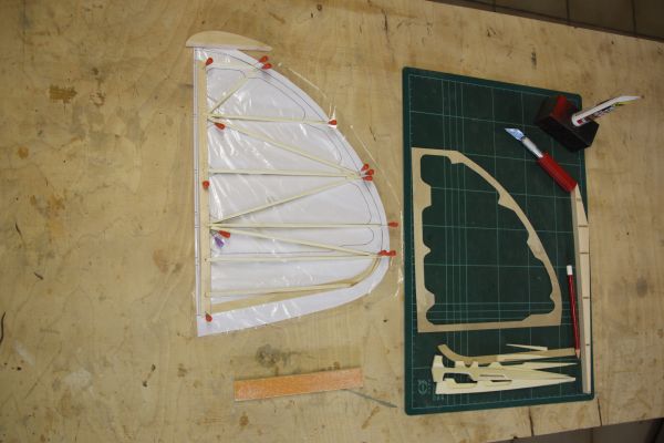 Die Verkastung besteht aus vier Abschnitte. An der Wurzelrippe bis Ende des Ypsilons wurde beidseitig 1mm Sperrholz verwendet. Dann folgt 0,6mm beidseitig, 0,6 mm einseitig und am Flügelende 0,4mm einseitig.