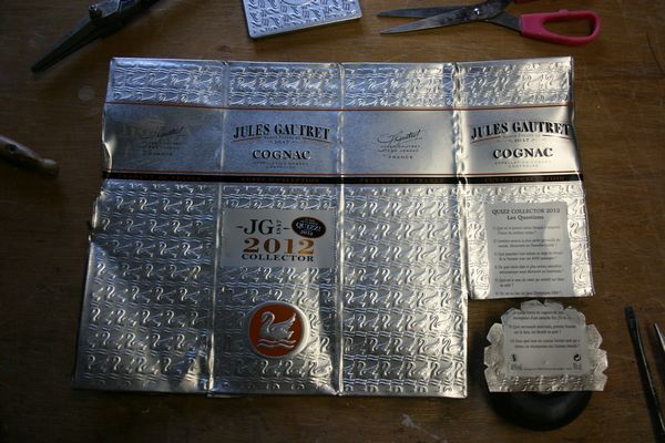 La boite de Cognac c'est bien du fer blanc type boite à gâteaux, ça se découpe tout seul avec une paire de ciseaux standard et ça se plie facilement.