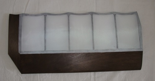 J'ai opté pour une partie coffrée, même si je ne suis pas convaincu qu'il y en avait une sur le modèle original, mais esthétiquement, j'aime beaucoup et puis je voulais essayer ... Donc direction la salle de bain pour tremper le CTP de 0.4mm, mise en forme progressive autour d'un tube de 8mm de diamètre, séchage, collage : finalement, ça se fait sans difficulté particulière.