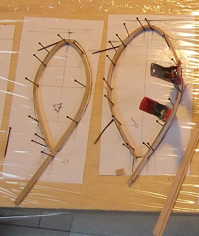I started with the frames, laminated from strips 0.6mm amd 0.4mm ply, soaked in very hot water (almost boiling)