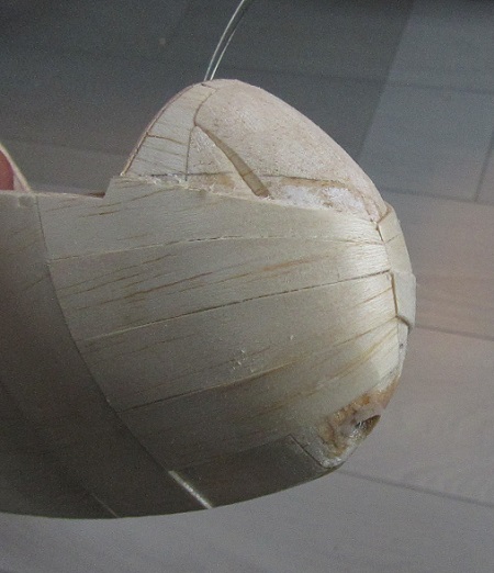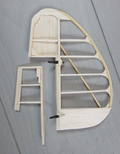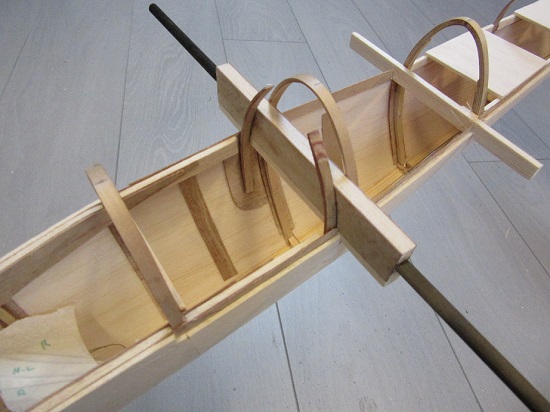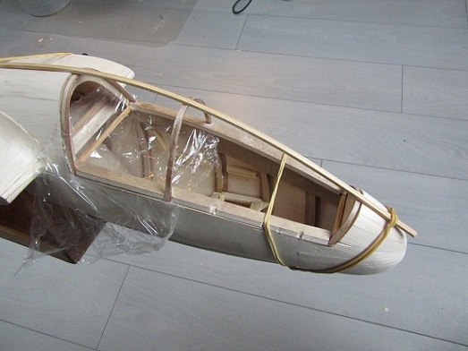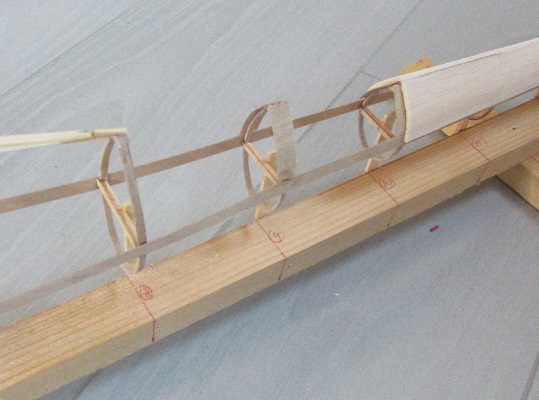 Two long 10mm wide strips 0.4mm ply to join the bottom and top half of the 2mm balsa skin and also strips glued over the frames to join the skin seams.