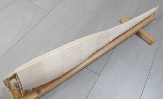 I went on with the topsides. I had to soak the 2mm balsa with hot water to bend it and I directly glued the wet balsa on the fuselage. I regret that because the balsa shrunk a bit, so I had to do some sanding to get it more or less straight.