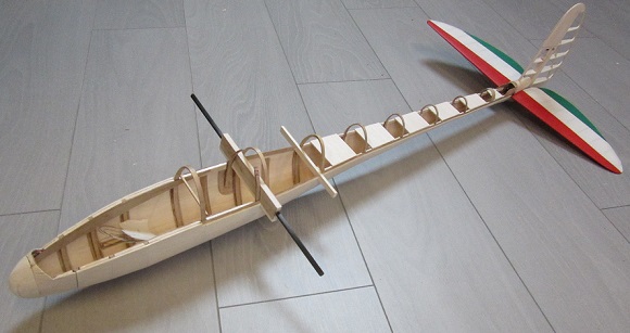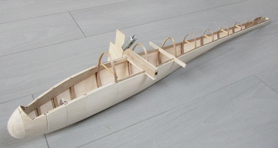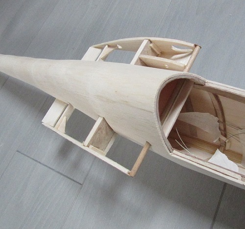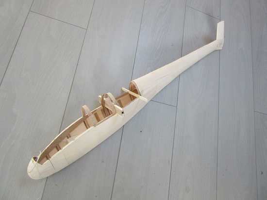 I put pieces of 2mm balsa sheet over the bottom half of the fuselage to give more stiffness. It weighs very little and I guess it is easier now to glue the 2mm balsa on the upper half. The steel wires for the elevator and rudder are already in place.