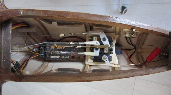 Just enough place for the servo's. Yes, some holes for the servo screws are close to the edge luckily there is a spruce batten under the ply. A 800mah 3cell lipo will fit in between the servo holder and nose at the left with the voltage regulator under the servo's. The receiver comes just behind the servo's on the bottom of the fuselage. The pilot must be "reduced " a bit to fit on top.