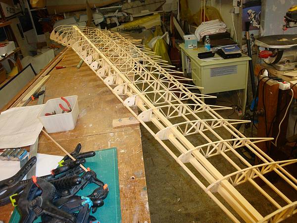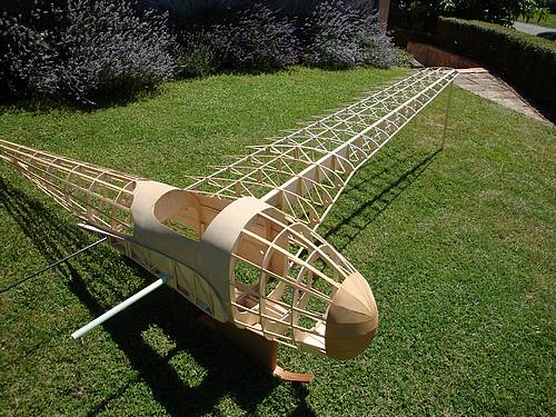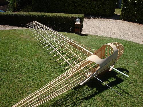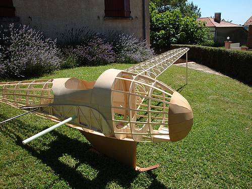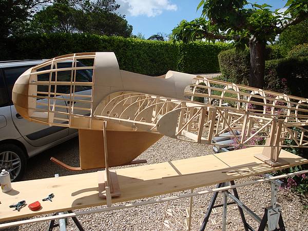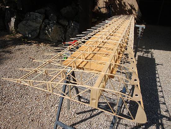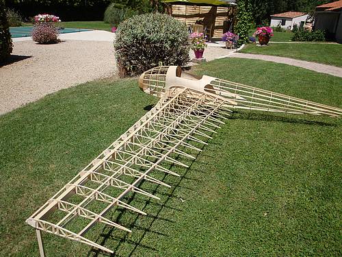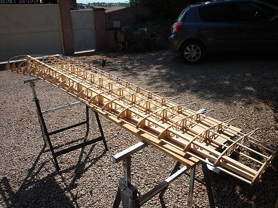 Oui Fred c'est la chaleur qui freine la cadence, encore 33° aujourd'hui vivement cet hiver pour reprendre le rythme. Marc pour le longeron construction à l'ancienne, entre chaque nervures, entretoises en CTP à l'emplanture jusqu'au tiers de l'aile et ensuite en balsa. J'ai tellement de petites chutes de bois que je les utilise pour les écluser.