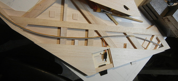 Prochaine étape : le stab, afin de positionner au mieux la gaine souple de commande du volet qui sera placée dans une saignée pratiquée dans les traverses de la structure.