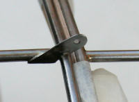 Articulation de la verrière sur le côté gauche, par une charnière à l'avant et un axe sur le montant arrière décalé afin d'avoir le dégagement nécessaire pour l'épaisseur du vitrage+têtes de vis. La charnière est faite avec des petits tubes brasés et un axe de 2mm percé recevant une goupille.