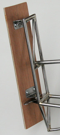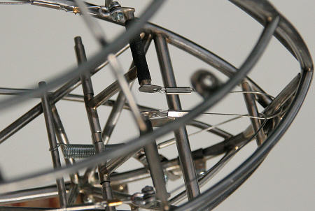Palier en tôle de 1mm dans lesquel est brasé un tube de 5mm, le tout monté sur un axe en tube de 4mm brasé sur la structure du fuselage. Le sertissage des câbles se fait par des petits tubes en laiton chromé achetés également au rayon pêche. Le câble est passé une seconde fois dans le tube, puis coupé, avant d'être écrasé.