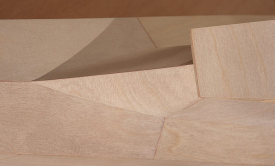 Les coffrages des ailes sont en CTP de 0.6mm. Les panneaux sont préformés en les mouillant afin de faciliter leur collage qui se fait ainsi avec moins de contrainte. Ils sont collés en premier de l'extrados au bord d'attaque en les maintenant avec des épingles et en alignant le bord du coffrage, puis encollage de l'intrados, les panneaux sont coupés plus large, ce qui permet d'avoir une prise pour tirer dessus