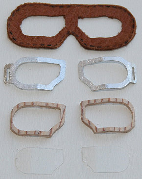 Les entourages des lunettes sont coupées dans du CTP multiplis de 5mm mis en forme. L'intérieur de l'alu est plus petit de 0.5mm pour former une feuillure et recevoir le rodhoïd. L'ensemble est peint puis collé à la néoprène sur le support en cuir.