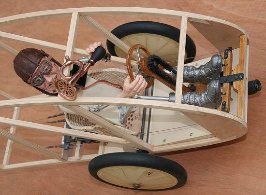J'avais envie de me faire plaisir à façonner un accessoire original. La trompe est entièrement martelée dans une feuille de cuivre de 0.5mm (une journée de boulot au marteau) la poire est en caoutchouc massif. Le vitrage avant étant ouvert au niveau de la main, on peut imaginer l'animation du bras qui ira jusqu'à la trompe: pouët pouët! avec le bruitage sur le MP3 programmé avec l'animation du pilote parlant Tchèque.