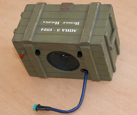 J'envisageais au départ d'installer tout le matériel d'animation derrière le pilote, mais vu l'encombrement et le poids, j'ai préféré construire une petite caisse en CTP qui sera posée au sol contre le planeur et qui se branchera discrètement sous le fuselage. L'animation ne se faisant qu'au sol, ça ne servait pas à grand chose d'embarquer cet équipement. Vue arrière, qui ne se verra pas, puisque la caisse sera contre le fuselage, avec le haut parleur, les interrupteurs et la prise du fuselage. La caisse est peinte à la Humbrol et vieillit, les lettrages sont peints avec un pochoir découpé à la CraftRobo.