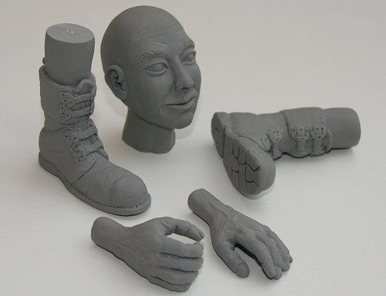 L'empreinte des semelles est usinée à la CNC, chaussures et chaussettes sont faites en plastiline. Les membres sont donc séparés du corps, il ne reste plus qu'à enrober tout ça dans du silicone épaissi, puis faire des coquilles autour en bandes platrées.