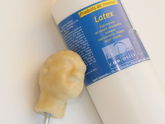 Vu le prix du silicone, il m'en a fallut presque un pot pour faire les 2 moules mains/tête à 32 euros le pot, il n'était pas possible de continuer de mouler mes autres têtes avec ce produit. J'essaye alors le latex, qui lui ne coûte presque rien, 8 euros le litre. Avec 1 litre il y a de quoi mouler plus de 40 têtes!