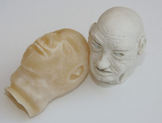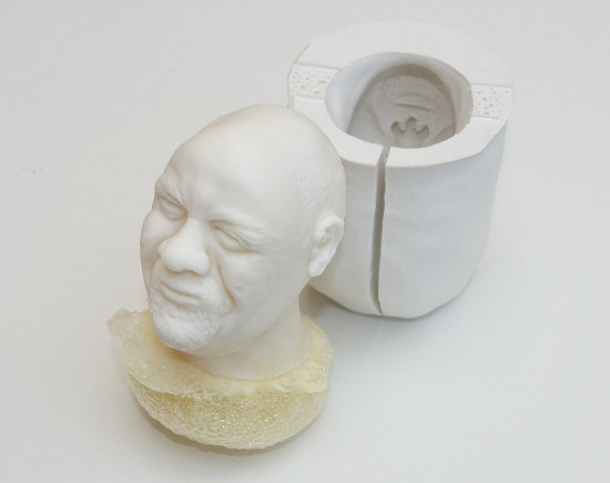 Moulage de la tête de Frédéric: cette fois ci je n'ai pas fait le moule en 2 parties comme pour les mains, mais tout coulé en un bloc.