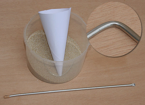 J'ai voulu essayer la méthode du sable pour cintrer le tube du volet de dérive, j'étais un peu septique du résultat et de la possibilité de remplir de sable un tube de 4mm. Tamisage fin au chinois de sable de filtration de piscine, un cornet en papier en guise d'entonnoir au bout d'un tube, l'autre extrémité est bouchée en la pinçant, je verse le sable, et........ effectivement le sable arrive à remplir le