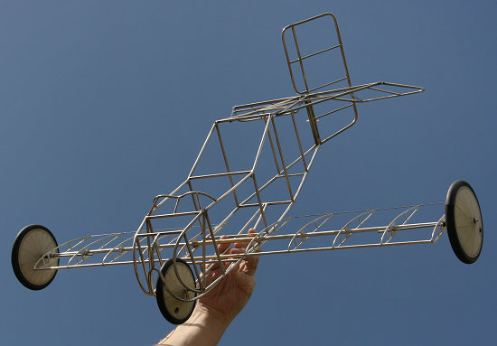 Après une journée de travail, la paire d'ailes inférieure est assemblée. La structure d'une demi-aile pèse 33g + 11g de tube et jonc carbone, total 44g. La paire d'ailes avec ses roues telle qu'elle est sur la photo pèse 195g.
